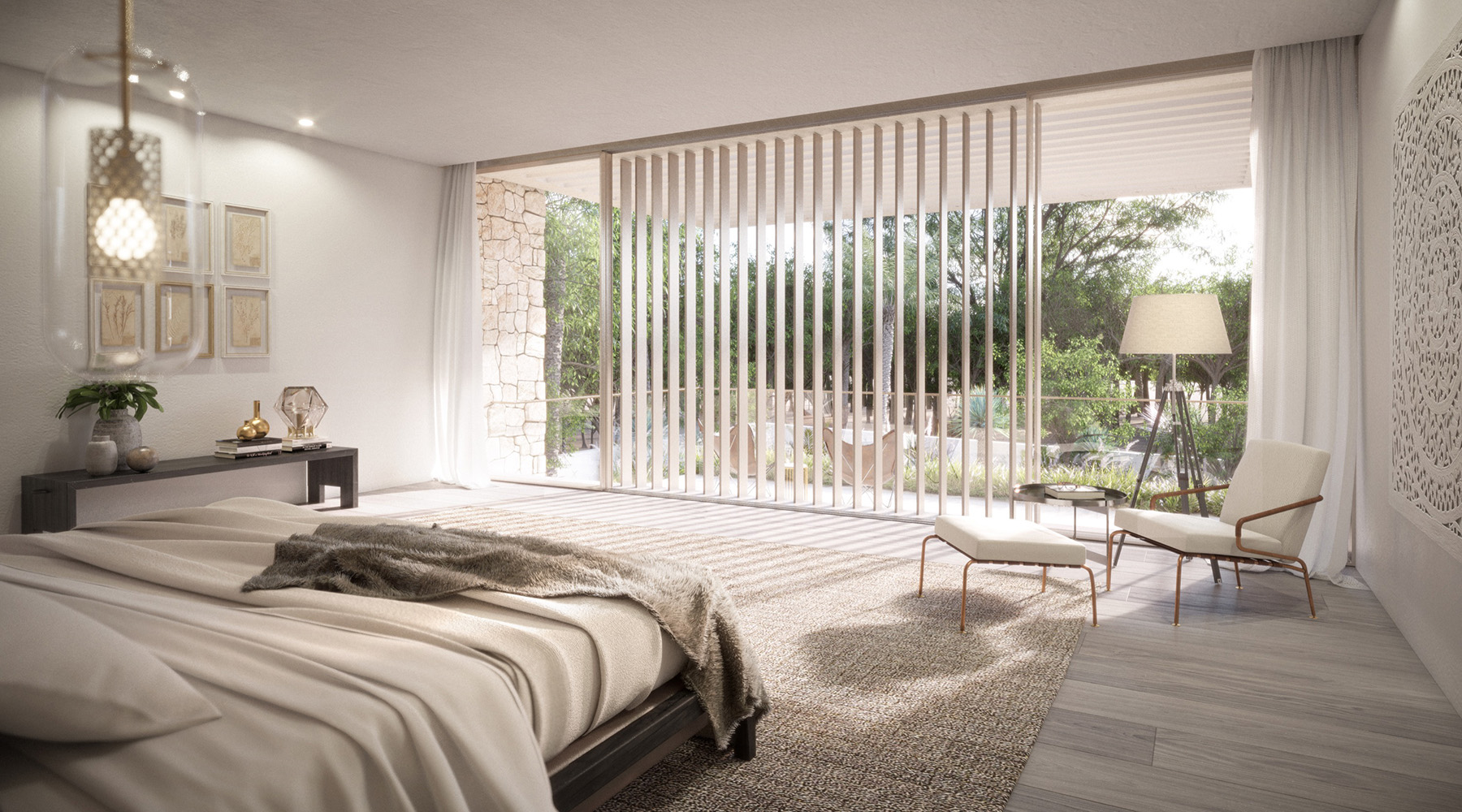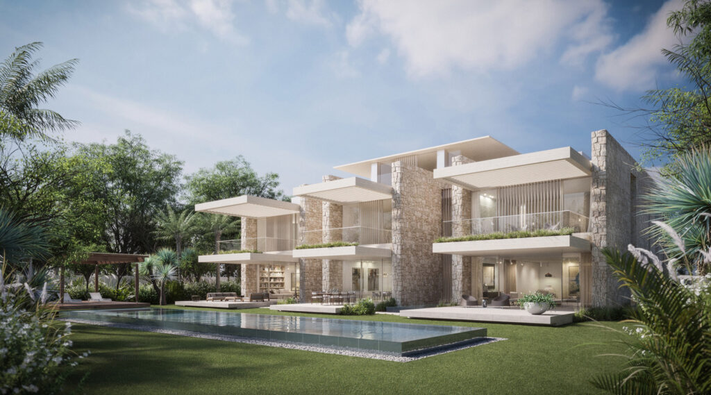 Auf der ersten Etage sind geräumige Schlafzimmer auf beiden Seiten positioniert, mit dem Familienzimmer und der Terrasse in der Mitte. Die luxuriöse Master-Suite nimmt das westliche Volumen ein und öffnet sich auf eine große Terrasse mit Blick auf den Pool und den Garten. Der Fitnessraum und das Spa befinden sich auf der Dachterrasse, um die Aussicht auf die Grünfläche zu nutzen. Das Kino und die Serviceräume sind so positioniert, dass natürliches Licht durch Lichtschächte und Oberlichter einfällt. Das Kino, das Kinderzimmer und großzügige Abstellräume befinden sich hier mit einfachem Zugang vom Poolbereich.