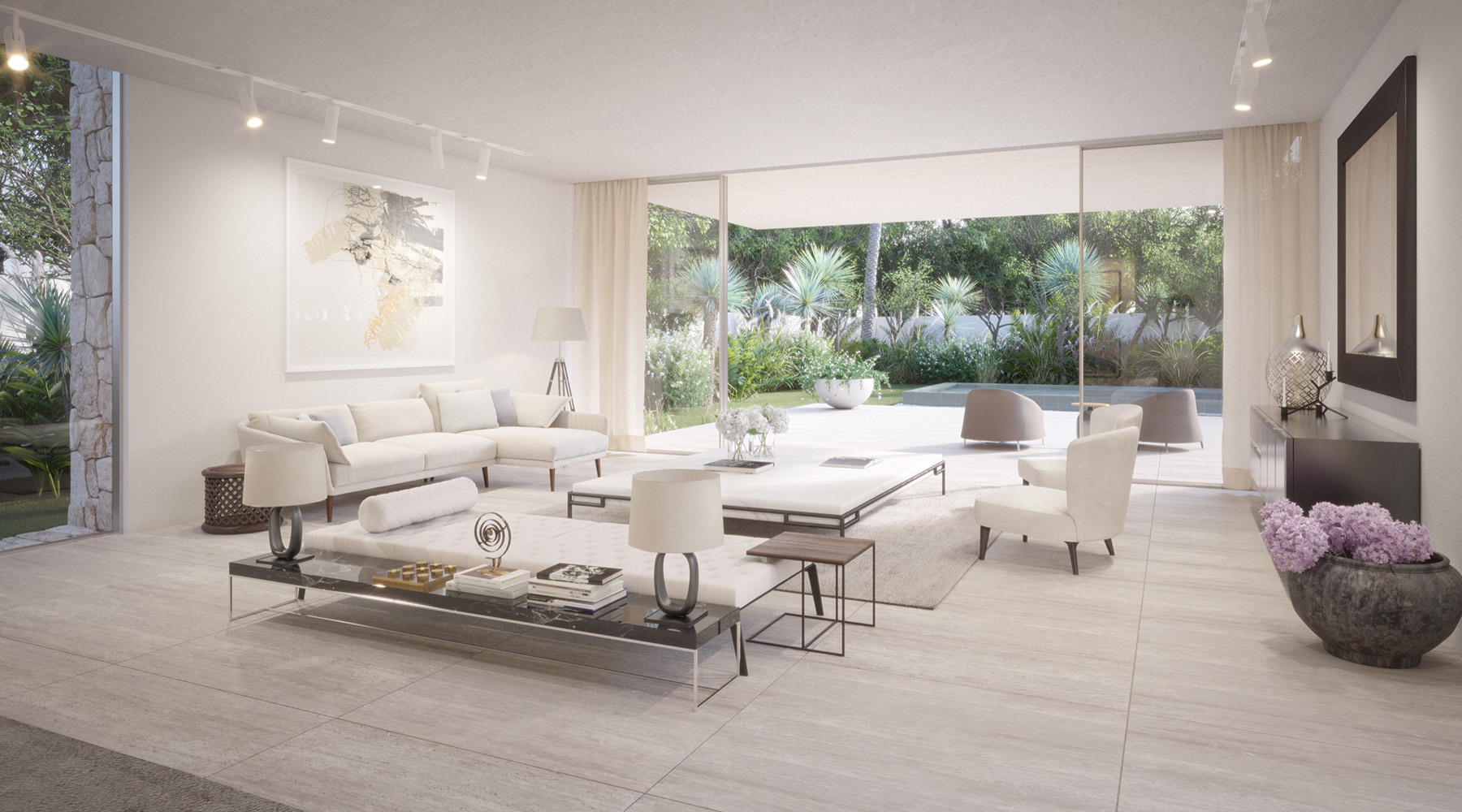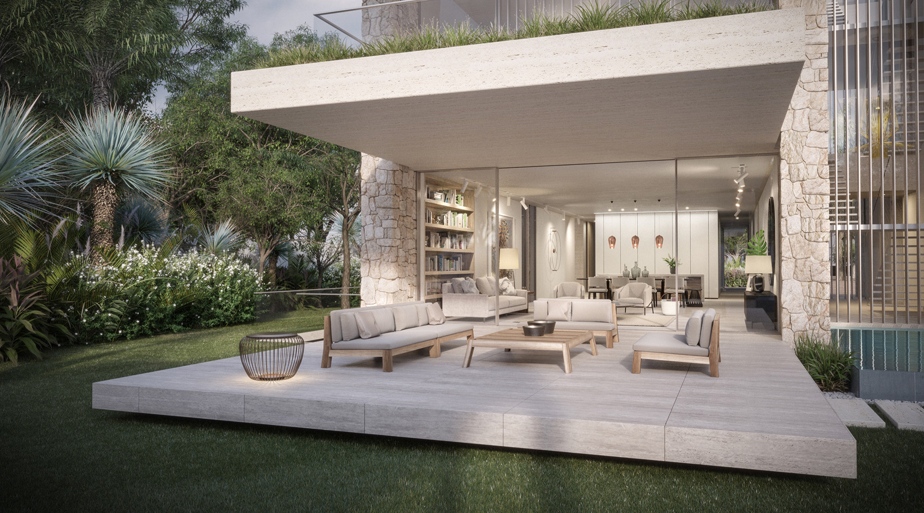 Eine Reihe von Natursteinmauern ist entsprechend den Gegebenheiten des Grundstücks angeordnet, mit kontrollierten Durchblicken zu beiden Seiten, die das Innere vor der stärksten Sonneneinstrahlung und vor dem Übersehen durch die großen Nachbarvillen abschirmen und den Blick auf den Pool und den Garten fokussieren, der sich visuell mit der dahinter liegenden Grünfläche verbindet und als Durchblick fungiert.