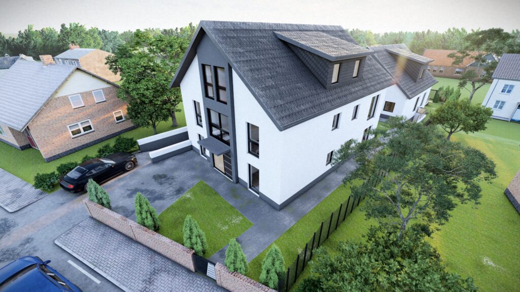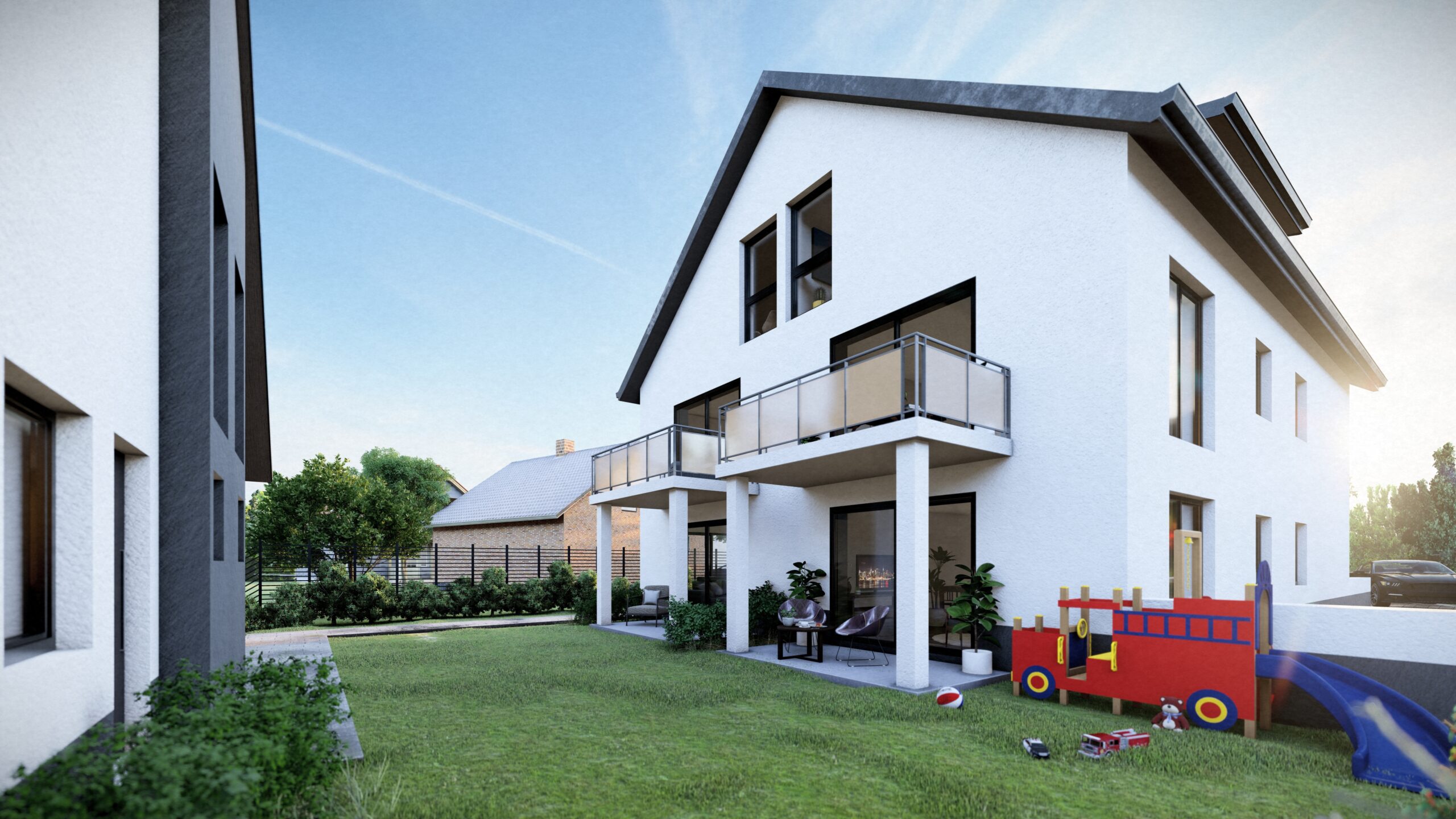 Zwei energieeffiziente Zweifamilienhäuser in Pfangstaft mit 2- bis 4-Zimmer-Wohnungen mit Wohnflächen von ca. 56m2 bis 105m2 Wohnfläche. Zur Bebauung gehört auch ein großer Tiefgaragenstellplatz.