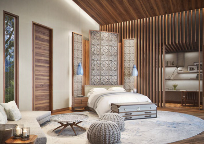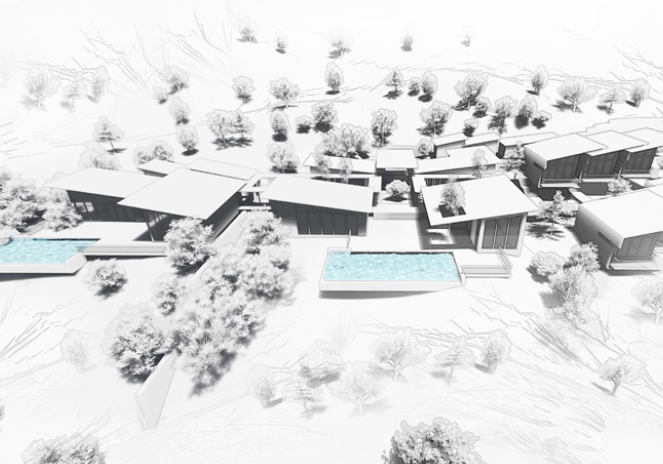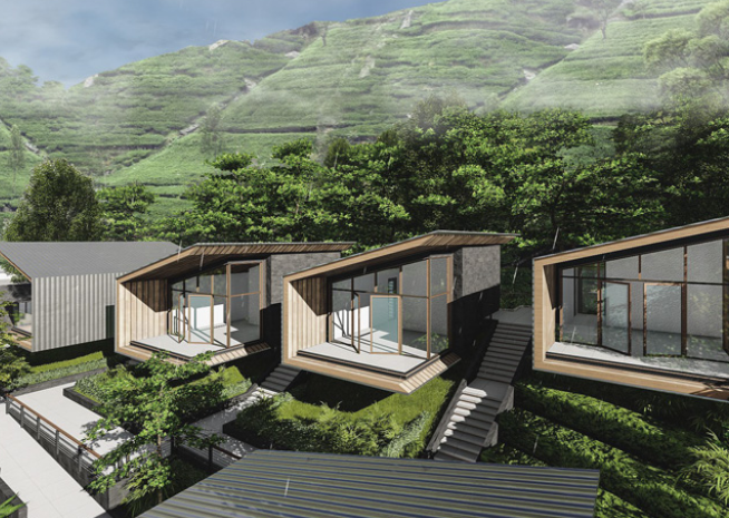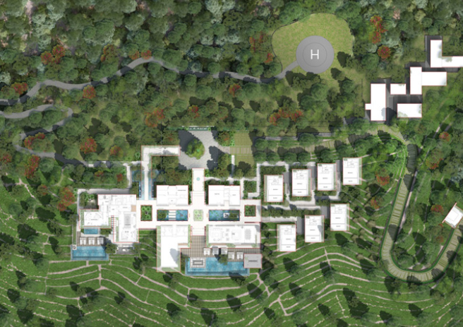 Das Projekt, das ein privates Luxus-Resort darstellt, besteht aus vier Schlüsselelementen wie der VIP-Suite, der Hauptvilla, die als Gemeinschaftsbereich für die Gäste dient, den privaten Bungalows und dem Back-of-House-Bereich, der die Unterbringung des Personals und die Dienstleistungen umfasst. Alle vier Elemente sind in einer horizontalen Komposition organisiert, um von der schönen Aussicht auf den Stausee zu profitieren und gleichzeitig die Privatsphäre zwischen ihnen zu wahren.